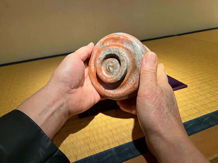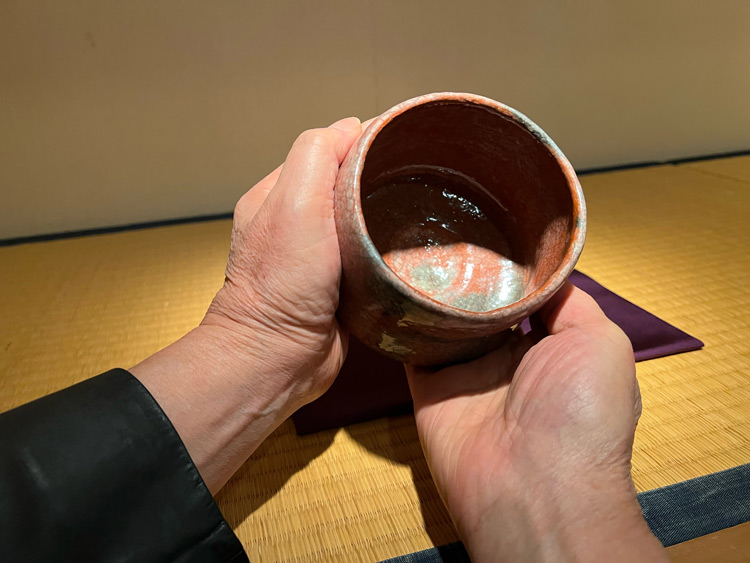 樂歴代の樂茶碗で飲むお茶を味わって、茶碗の手触りを体験。おいしいお菓子もでます。